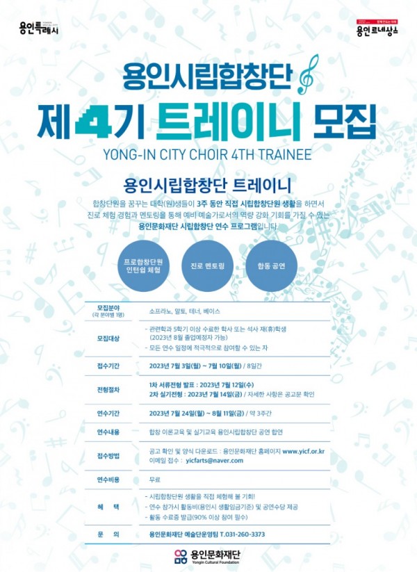 용인문화재단(이사장 이상일)은 용인시립합창단 제4기 트레이니 참여자를 오는 10일까지 모집한다고 밝혔다. ‘용인시립합창단 트레이니’는 2018년부터 진행해온 용인문화재단의 시립합창단 연수 프로그램으로 프로합창단원을 꿈꾸는 대학(원)생 대상으로 방학 기간 인턴십을 진행해 진로 체험 경험을 제공하고 있다. 또한 간담회 진행을 통해 진로 멘토링과 용인시립합창단과의 합동 공연을 추진해…