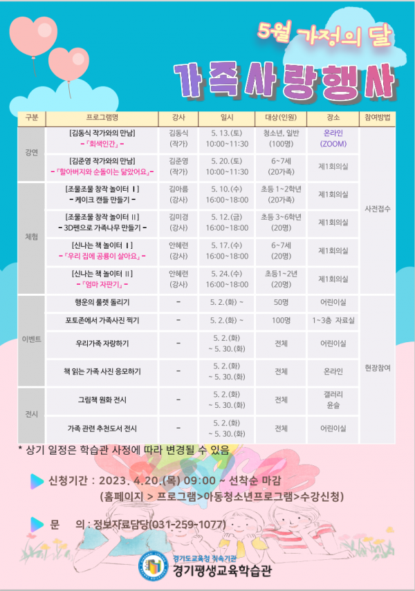 ◦책과 함께 온 가족이 함께 즐길 수 있는 가족사랑행사 운영◦작가와의 만남, 체험, 이벤트, 원화 전시 등 다채로운 프로그램 마련 경기평생교육학습관(관장 윤재철)이 5월 가정의 달을 맞아 온 가족이 함께 즐길 수 있는 가족 독서체험 프로그램을 운영한다. 이번 가족 독서체험 프로그램은 5월 한달 간 ‘사랑하는 우리가족’이라는 주제로 진행되며 가족과 함께 독서 분위기를 조성하고 가족의 소중함…