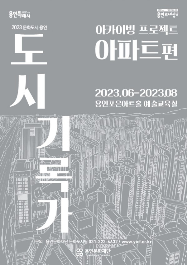사진 설명 : 2023 문화도시 용인 아카이빙 프로젝트 아파트편 포스터 용인문화재단(이사장 이상일)은 용인 곳곳을 누비며 문화자원을 발굴하고 기록하는 ‘도시기록가’를 오는 19일까지 모집한다고 밝혔다. 2022년부터 시민의 관점에 도시 문제를 정의하고 기록하는 과정을 통해 시민 활동가의 역량을 강화시켜 시민들이 주체적으로 활동할 수 있는 장을 마련하고자 기획된 사업인 ‘도시기…