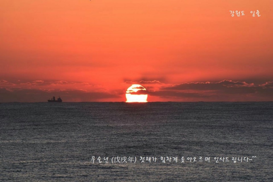 2018년 戊戌年 첫해가 힘차게 솟아오르며 인사드립니다. 본문 2018년 戊戌年 강원도 첫해가 인사드립니다. 장춘란 2018-01-02 00:00 가 본문내용 확대/축소 목록 댓글목록 이전글 봄, 여기 18.03.14 다음글 경제야~ 살아나라~~~^^ 17.08.24