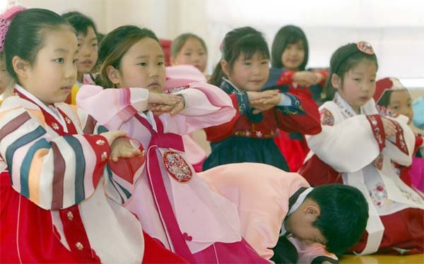어린이들에게 경로사상과 전통예절을 가르치기 위해 열린 일일예절학교에서 아이들이 한복을 차려 입고 절을 올리고…