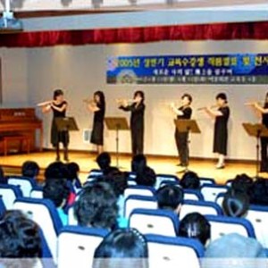 여성회관에서 열린 2005년 상반기 교육수강생의 작품 발표회 및 전시회에서 플릇연주에 한창인 참가자들의 모습이다.