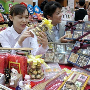 수능시험을 앞둔 신세계 백화점 강남점을 찾은 소비자들이 행운선물 전문매장에서 수능합격기원 초콜릿, 찹쌀떡 등을 고르고 있다